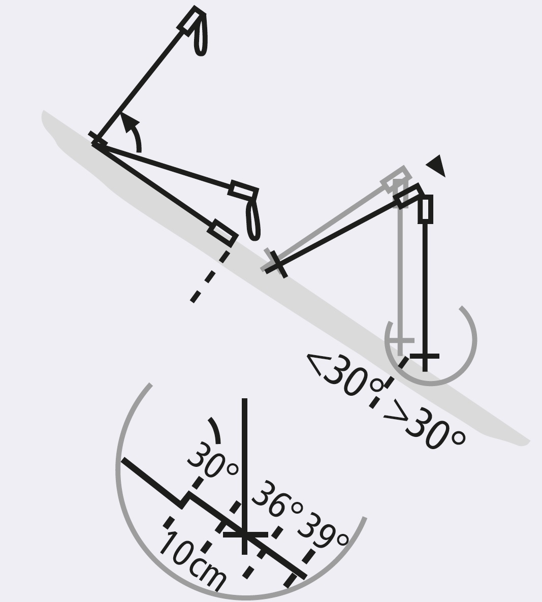 Trifft der lotrecht hängende Stock unterhalb der Markierung auf die Schneeoberfläche, ist der Hang steiler als 30°, sonst flacher. 10 cm Abstand von der Markierung entsprechen ca. 3°.