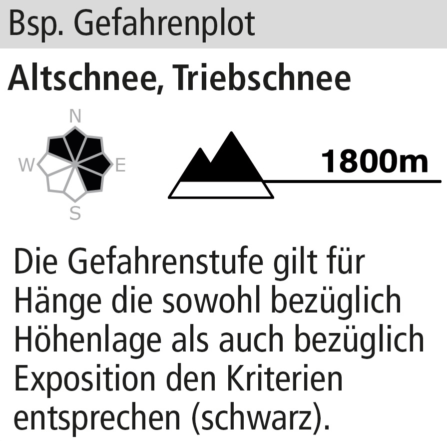 Die Lawinengefahr wird mit der Gefahrenstufe inkl. Höhe und Exposition wo sie gilt (Gefahrenplot), den typischen Lawinenproblemen und einem Text beschrieben.