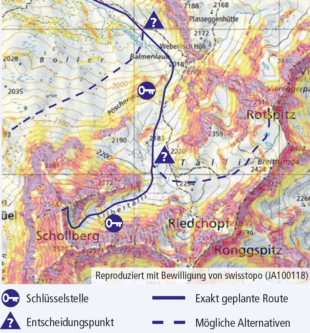 Sinnvolle Tour auswählen (machbar / realistisch). Hier bieten verschiedene Internetseiten, Tourenportale sowie Führerliteratur Unterstützung.