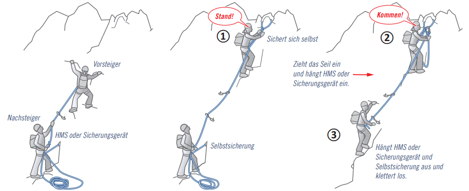 Die Kommunikation zwischen den Seilpartnern beschränkt sich auf das Nötigste. Zwei Kommandos reichen: ① Stand! und ② Kommen!
